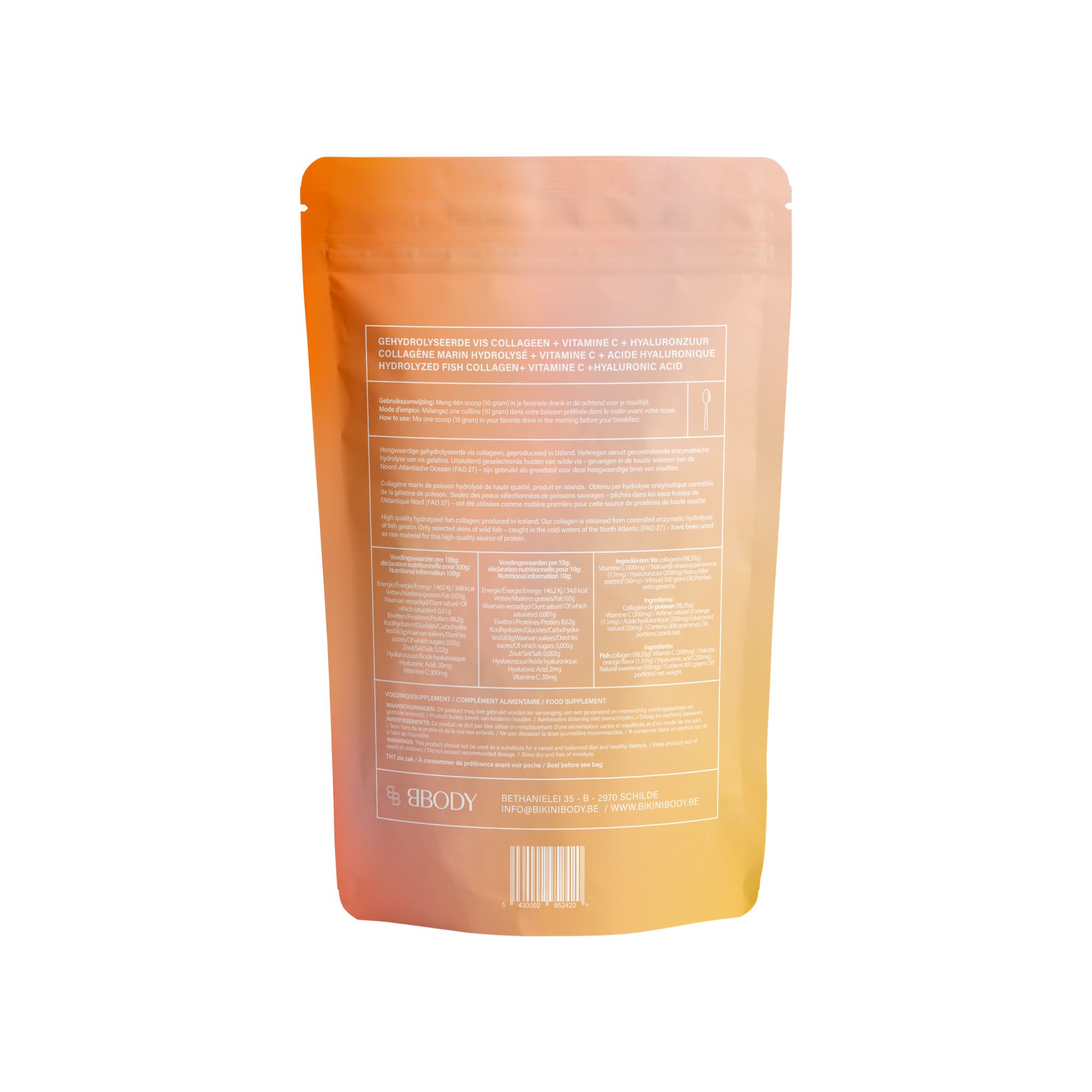 Hoogwaardige gehydrolyseerde vis collageen, van wilde vis uit in IJsland. Verkregen vanuit gecontroleerde enzymatische hydrolyse van vis gelatine. Gehydrolyseerd collageen wordt gemakkelijker opgenomen, verteerd en verspreid door het lichaam. Het poeder met sinaasappelsmaak, kan worden opgelost in (koud)
